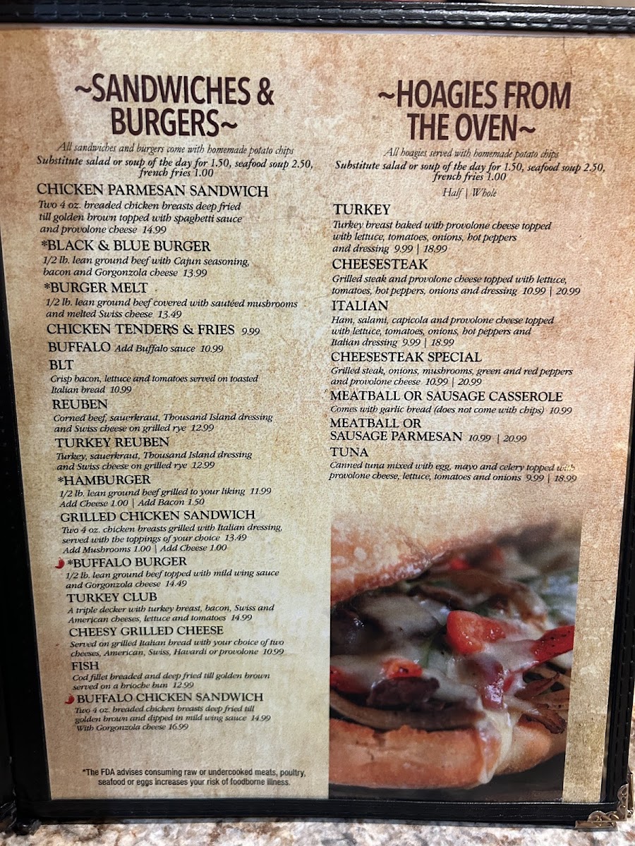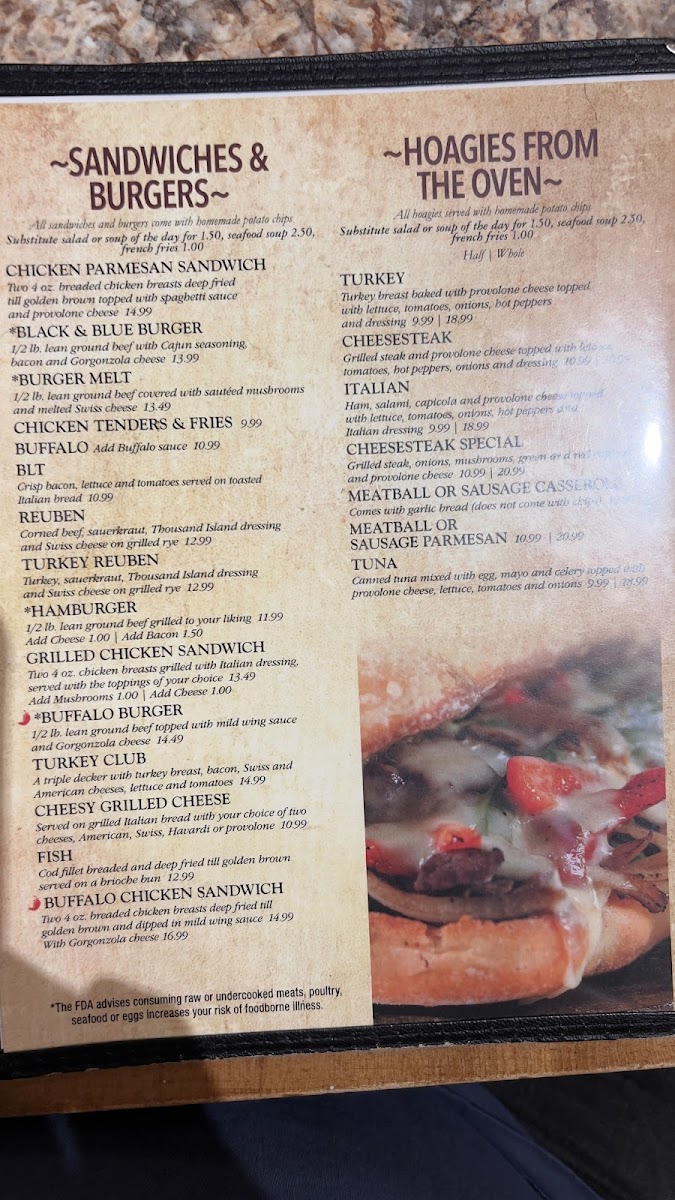 Appetizers like crispy Calamari and the flavorful Buffalo Chicken Dip complement the straightforward, homey feel of the restaurant. Salads and soups offer lighter, fresh options, perfect for balancing a meal or enjoying as a satisfying start. Rounded out with a modest wine selection, the menu supports relaxed social moments or simple meals that feel familiar and approachable.
